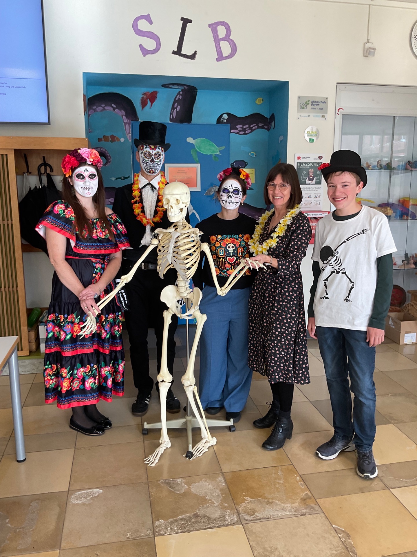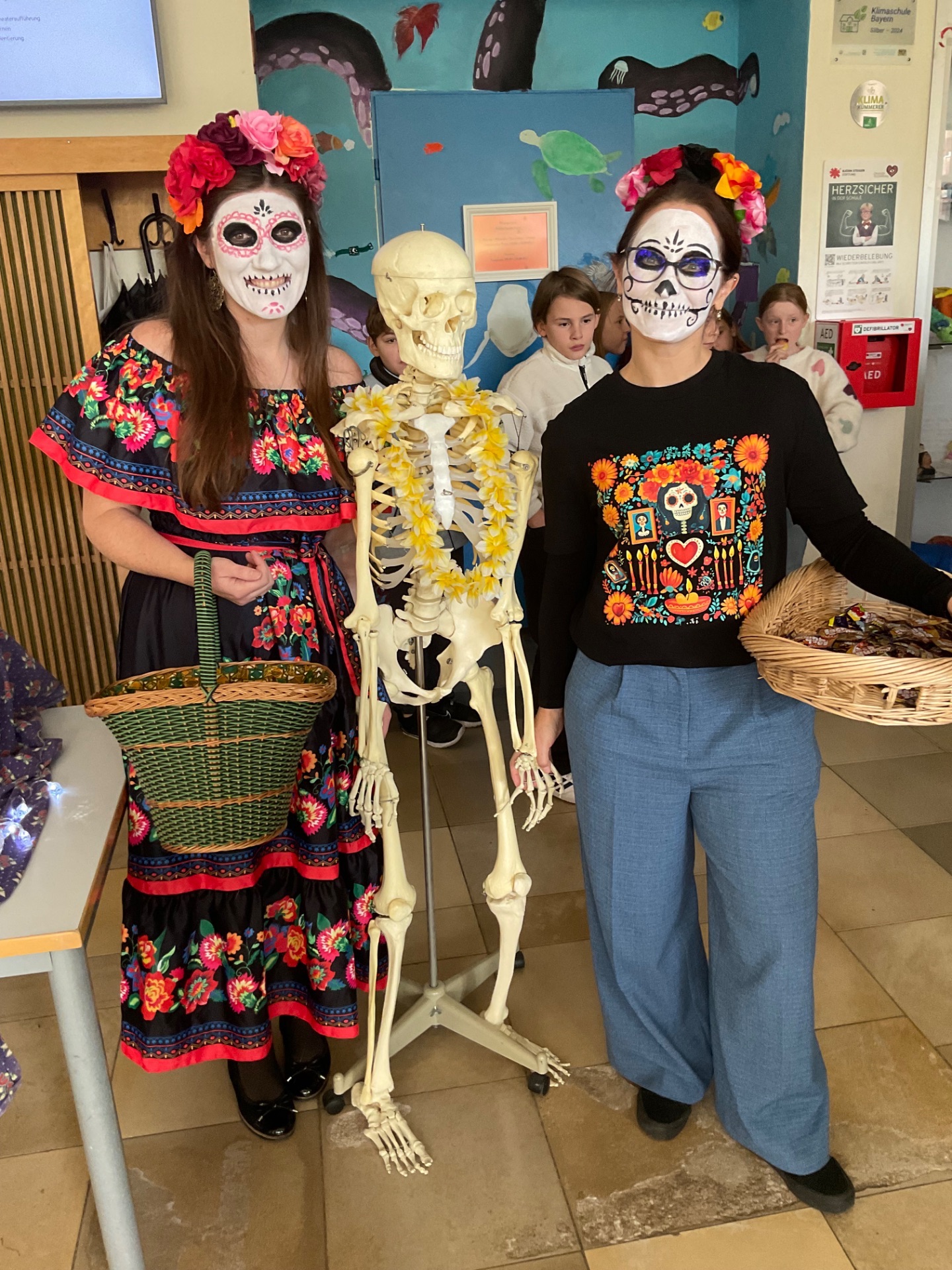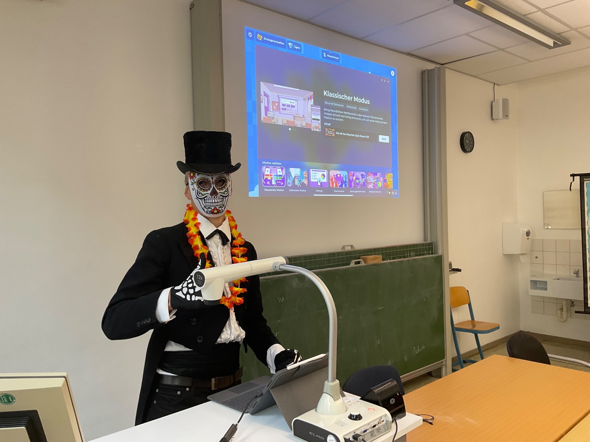 Kurz vor den Herbstferien wurde es am CvL farbenfroh: Die Spanischfachschaft feierte erneut den Día de los muertos. In der Pause begegneten die Schülerinnen und Schüler der geschminkten „La Catrina“ und „Don Difunto“ und erfuhren Spannendes über das mexikanische Fest, das vom 31. Oktober bis 2. November gefeiert wird.
