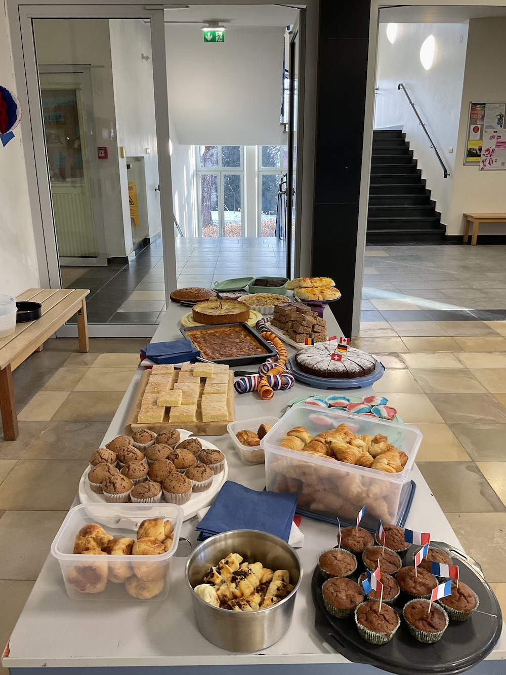 In der verlängerten Pause von 10.00 bis 10.25 Uhr verwandelte sich die Aula in ein Stück Frankreich. Zahlreiche Schülerinnen und Schüler kamen in den Farben bleu–blanc–rouge und sorgten so für ein stimmungsvolles Bild. Französische Musik, köstliche Spezialitäten und eine fröhliche Atmosphäre machten den Pausenspaß perfekt. Bei einem Kahoot sowie mithilfe von Informationsplakaten konnten sich die Teilnehmenden nicht nur über Frankreich, sondern auch über unsere neue Partnerschule in Cambrai informieren.