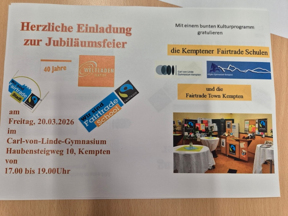 Am 20. März 2026 wurde das Carl-von-Linde-Gymnasium zum festlichen Mittelpunkt eines besonderen Jubiläums: Der Weltladen Kempten feierte sein 40-jähriges Bestehen. Gemeinsam mit dem Allgäu-Gymnasium gestaltete das CvL als Fairtrade-Schule diesen Abend maßgeblich mit.
