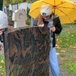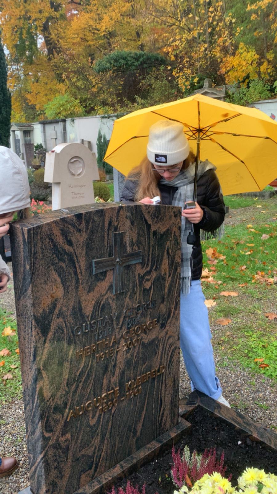 Die erste führte den Kurs auf den evangelischen Friedhof unterhalb der Burghalde, denn hier lassen sich Magmatite, Migmatite, Metamorphite und Sedimentite nicht nur in kleinen Handstücken vergleichen, nein, ein Grabstein ist meist doch recht groß und damit natürlich auch eindrucksvoller. Man kann die einzelnen Minerale in voller Größe betrachten, mit der Lupe im Detail untersuchen und außerdem mit den Mineralen den nebenstehenden Grabsteins direkt vergleichen. So bekamen die Gesteine trotz des Dauerregens ein Gesicht!
