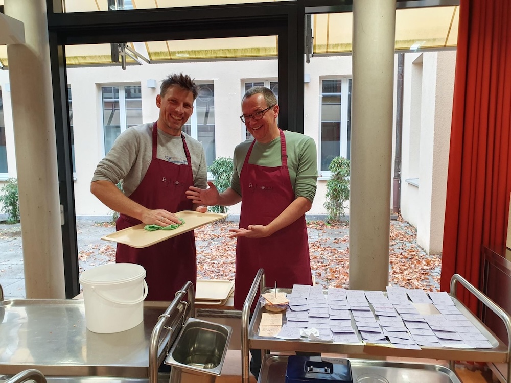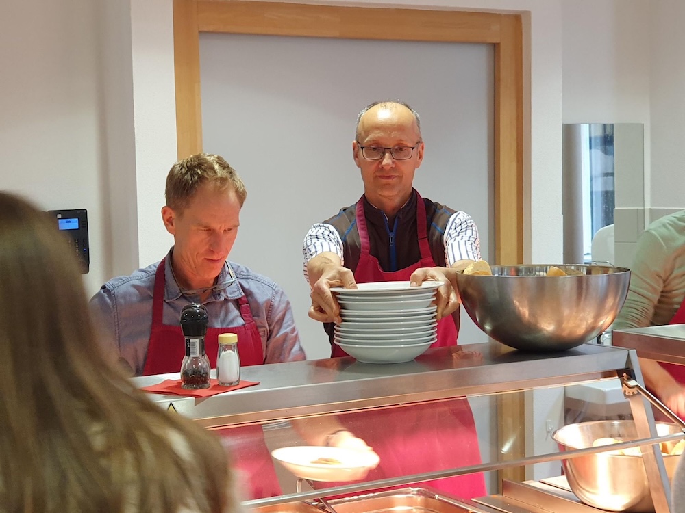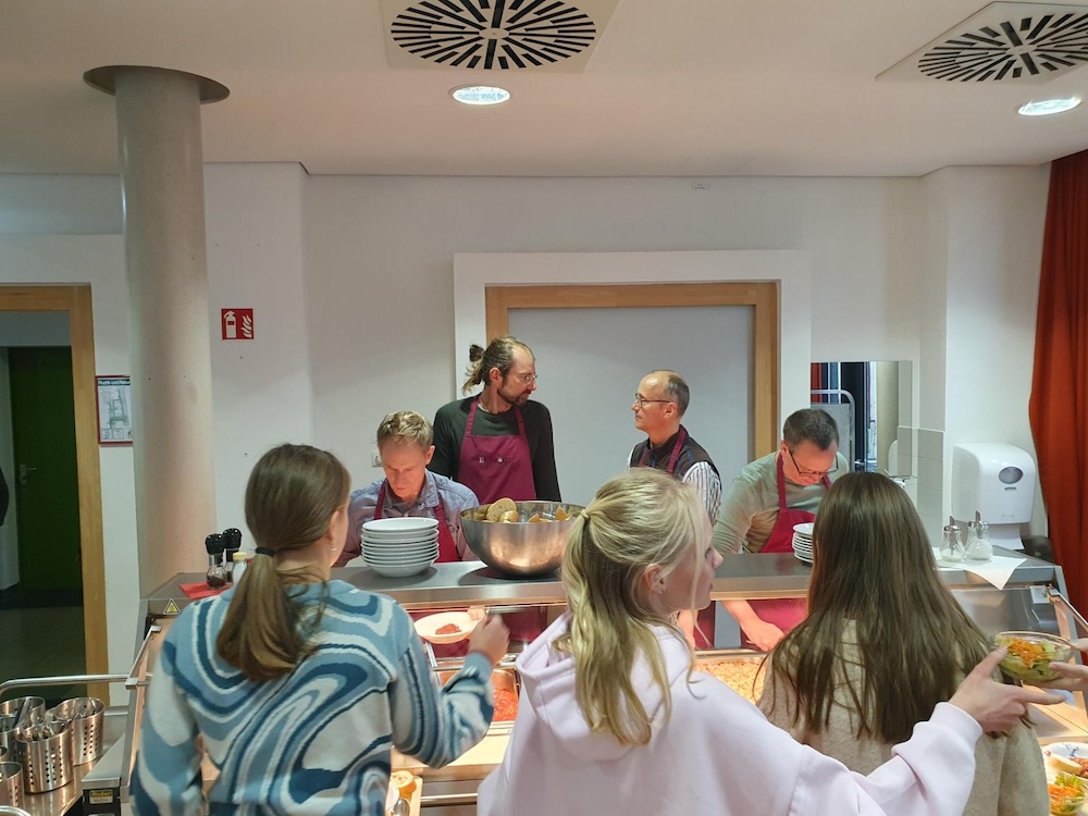 Ein Vergleich mit anderen Speisen macht deutlich, wie viel wir durch Veränderung unserer Essgewohnheit erreichen können: Durch den Verzehr eines Kalbschnitzels mit Pommes (im Vergleich zum Menü vom 24.11.25: Chili sin Carne, Salat und Apple Crumble) wird pro Portion ca. 20-mal so viel CO2 ausgestoßen. Manche Schülerinnen und Schüler, aber auch andere aus der Schulgemeinschaft erfuhren erst im Nachhinein, dass sie gerade etwas Veganes gegessen hatten. „Das war ja voll lecker!“, war da zu hören. Das hören wir natürlich gerne – und fanden wir auch! 😉