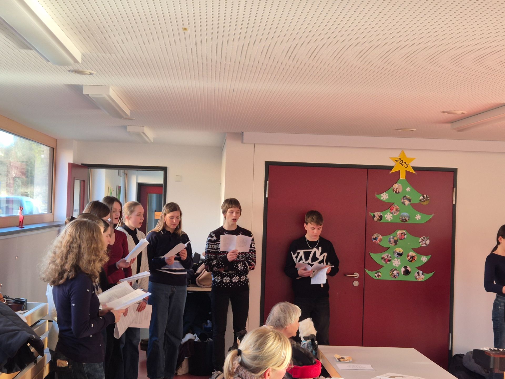 Schülerinnen und Schüler der Klasse 9c besuchten am vorletzten Schultag vor den Weihnachtsferien die Tagesstätte der Lebenshilfe Kempten und sangen und musizierten eine Stunde lang mit den versammelten Bewohnerinnen und Bewohnern Weihnachtslieder.