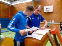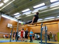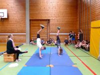 Am letzten Schultag vor den Osterferien war es soweit. Schüler und Schülerinnen der 5. Und 6. Jahrgangsstufe hatten sich die vorangegangenen Sportstunden fieberhaft auf den internen Schulwettbewerb vorbereitet. Aus einem, von der Sportfachschaft erstellten Turnkatalog hatten die Schüler sich selbständig Auf- und Abgänge sowie Mittelteile verschiedener Schwierigkeitsgrade ausgewählt, zu einer Übung zusammengestellt und geübt.