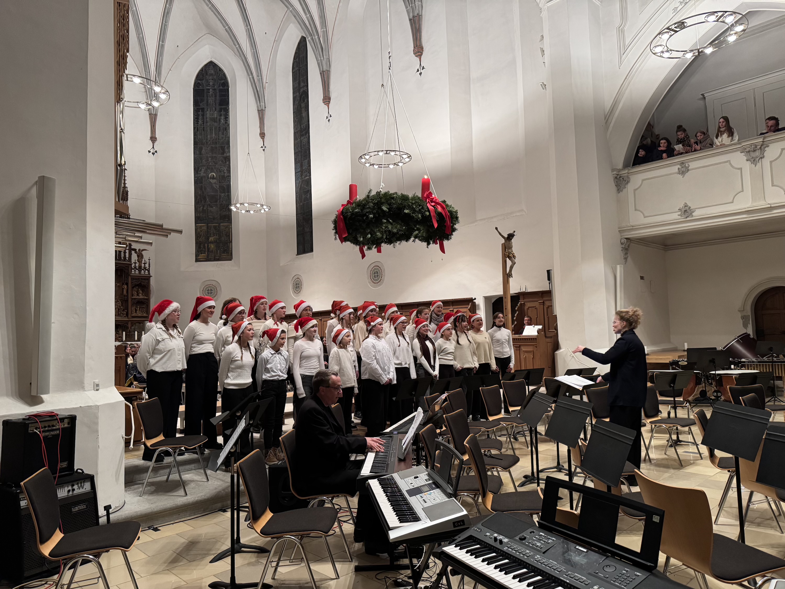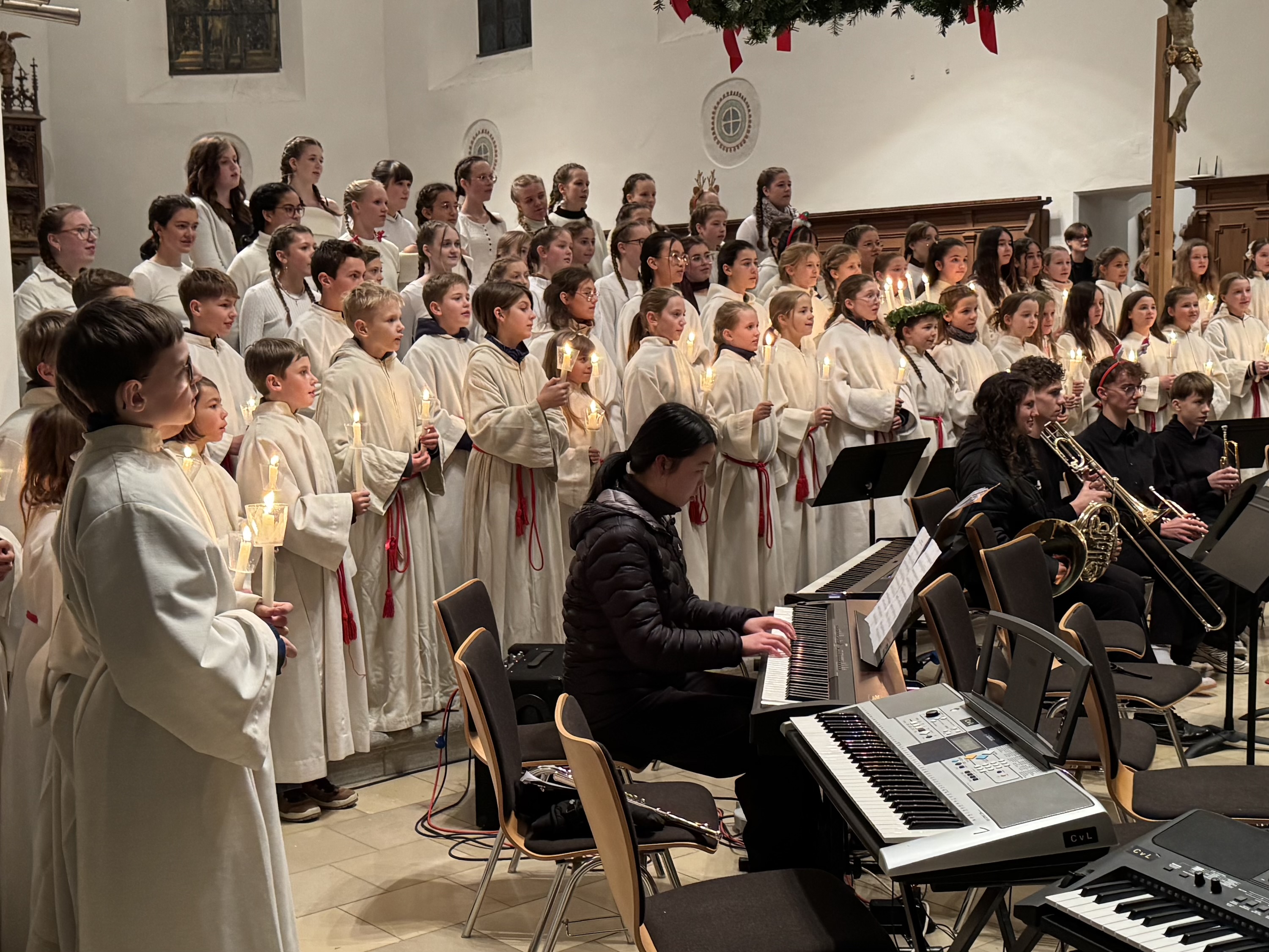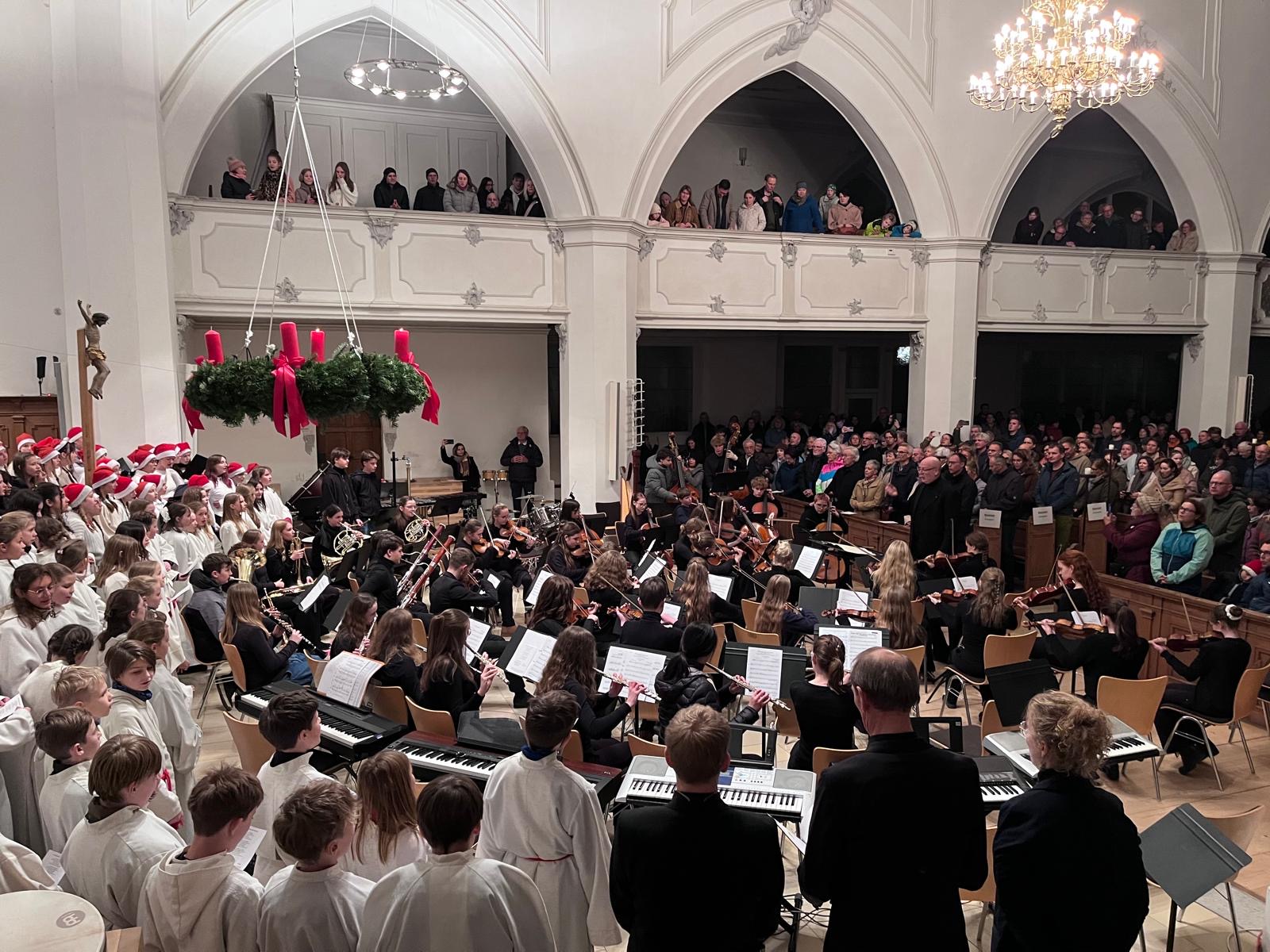 Mit einem beeindruckenden Weihnachtskonzert versetzte das Carl-von-Linde-Gymnasium Kempten die vollbesetzte St.-Mang-Kirche in festliche Stimmung. Über 200 musizierende Schülerinnen und Schüler zeigten in den beiden Orchestern, in den drei Chören und in der Bigband außergewöhnliche musikalische Leistungen. Besonders hervorzuheben ist die herausragende Leistung von Viktoria Lukschandel (8c), welche mit Buxtehudes Präludium und Fuge in C - Dur an der Orgel brillierte.