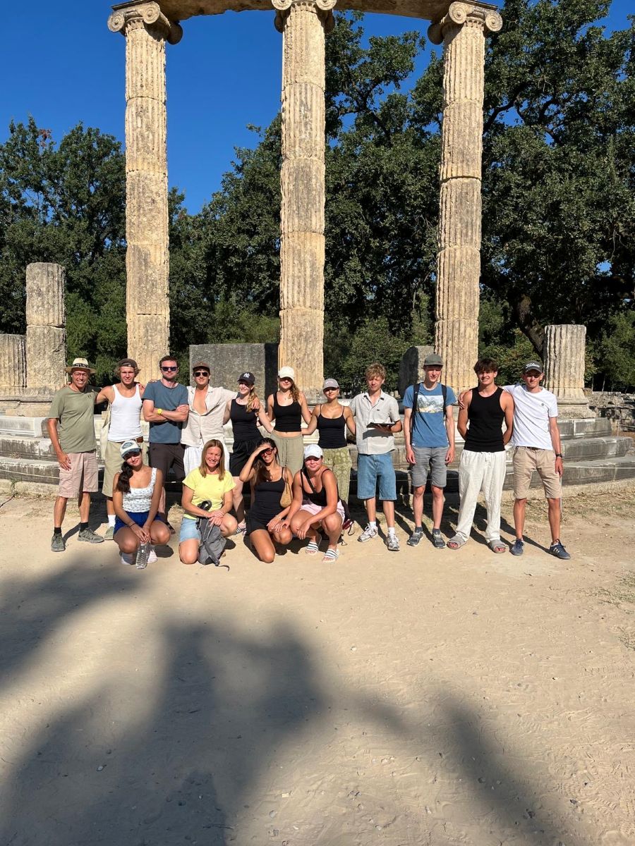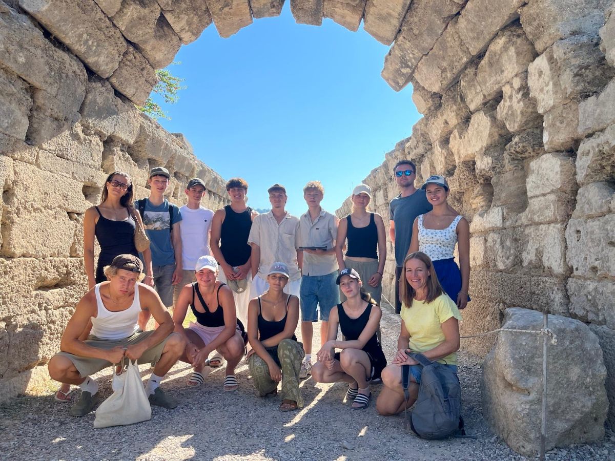 Am nächsten Tag fuhren wir weiter nach Mykene, Heimat des sagenumwobenen Agamemnon. Besonders das weltberühmte Löwentor und die gewaltigen Mauern der Festung, die sog. Kyklopenmauern, beeindruckten uns zutiefst. Das kühle Museum war eine schöne Abwechslung zur griechischen Hitze und überzeugte uns vor allem mit seinen spannenden Ausstellungsstücken. Danach ging es in das hübsche Städtchen Nafplio mit seinen engen Gassen, bunten Häusern und einer belebten Uferpromenade. Dort wurde wieder gebadet, gelacht und genossen. Am Abend erreichten wir schließlich Olympia, wo wir beim gemeinsamen Abendessen auf eine bewegende Reise zurückblickten. Am nächsten Morgen besuchten wir noch die antike Sportstätte von Olympia, dem Ursprungsort der Olympischen Spiele. Leider reichte die Zeit nicht mehr für das Museum – die Fähre wartete.