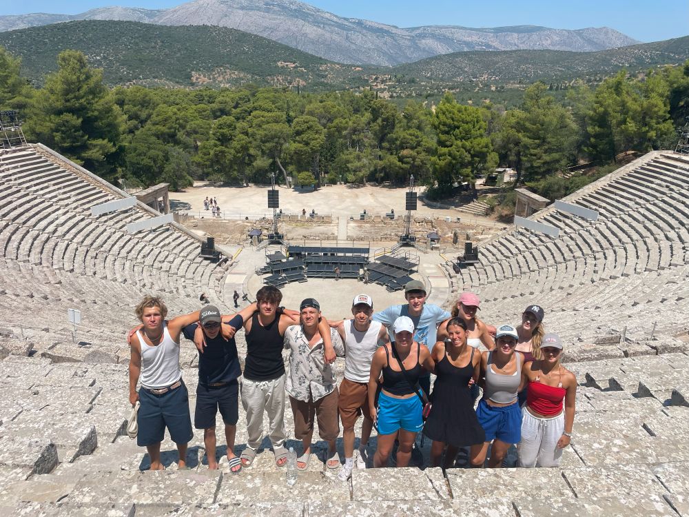Am nächsten Morgen ging es weiter zum Kanal von Korinth – ein Meisterwerk der Ingenieurskunst, das wir bei einem kurzen Zwischenstopp bestaunten. Natürlich hatte Herr Schulze auch hier interessante Anekdoten parat. In Epidauros bewunderten wir anschließend das größte erhaltene Theater der Antike, dessen beeindruckende Akustik auch heute noch weltweit ihresgleichen sucht. Herr Dieter testete diese eindrucksvoll, indem er eine Münze fallen ließ und ein Stück Papier zerriss, was man sogar in der letzten Reihe des Theaters hören konnte. Am Abaton führten unsere Lehrer sogar ein kleines Rollenspiel vor. Den Nachmittag und die Nacht verbrachten wir im idyllischen Badeort Tolo, wo wir uns am schönen Strand ausruhten. Die Stimmung war ausgelassen, das Wasser warm und der Sonnenuntergang malerisch.