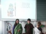 Eine kurze Anfrage bei unseren Schülern reichte und wir hatten sofort Freiwillige an der Hand, die Feuer und Flamme für die Idee waren. Begeistert gingen und gehen sie mit uns auf Tour, in originalgetreue Gewänder gekleidet und mit Powerpoint-Präsentation und Arbeitsblättern ausgestattet. Jeweils 50 bis 60 Minuten lang bringen sie ihren jüngeren Kollegen römische Kultur und technische Leistungen näher - am Beispiel der Römerstadt Cambodunum, aber auch mit Hinweis auf den Hortfund von Wiggensbach und andere Realien mit direktem lokalen Bezug. Ebenso decken sie sprachliche Spuren der Römerzeit auf: Die Allgäuer "Feel" ist z.B. ein seltener Schatz - sie geht direkt auf die lateinische filia zurück. Dieses Dialektwort findet sich nur in Schwaben entlang des spätrömischen Limes. Auch unser Ur-Allgäuer Wort "Schumpen" (weibliches Rind vor dem ersten Kalb) ist so einen Rarität: Es kommt von iumentum "Zugtier". Unsere Anschauungsobjekte machen die Dinge aber dann wortwörtlich begreifbar: Eine brennende Öllampe nach antikem Vorbild zu sehen, römische Münzen in der Hand zu halten, selber auf ein Wachstäfelchen zu schreiben oder römische Gewänder anzuziehen, das macht Spaß und bleibt im Gedächtnis.