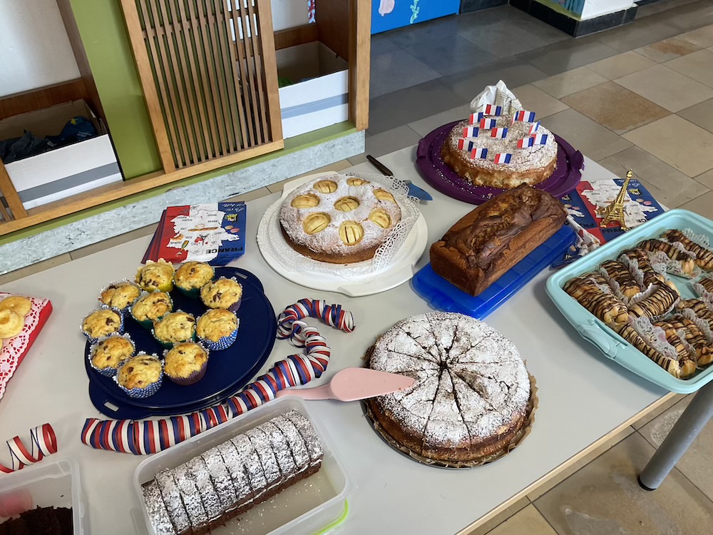 In der verlängerten Pause von 10.00 bis 10.25 Uhr verwandelte sich die Aula in ein Stück Frankreich. Zahlreiche Schülerinnen und Schüler kamen in den Farben bleu–blanc–rouge und sorgten so für ein stimmungsvolles Bild. Französische Musik, köstliche Spezialitäten und eine fröhliche Atmosphäre machten den Pausenspaß perfekt. Bei einem Kahoot sowie mithilfe von Informationsplakaten konnten sich die Teilnehmenden nicht nur über Frankreich, sondern auch über unsere neue Partnerschule in Cambrai informieren.