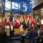 Auf dem Tagesplan stand an diesem Tag ein Besuch des europäischen Parlaments. Dort angekommen, mussten wir erst den Security Check passieren und wurden schließlich von Frau Pappelau in Empfang genommen, die uns einen ersten Überblick über das Gebäude verschaffte. Anschließend trafen wir erneut Herrn Markus Ferber, mit dem wir ein offizielles Foto machten und dem wir anschließend in einem Saal Fragen stellen konnten. Jetzt wissen wir, in welcher Reihenfolge die europäischen Flaggen im europäischen Parlament angeordnet sind. Leider verging die Zeit sehr schnell und der nächste Programmpunkt, ein Besuch im Plenarsaal, stand an. In der Sitzung wurde heftig über die Unterstützung der Ukraine diskutiert, was für uns alle eine interessante Erfahrung war. Nach einem gemütlichen Mittagessen stiegen wir in den TGV in Richtung Kempten.