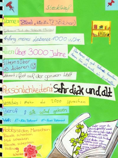 Die katholische Gruppe 5ab und die evangelische Gruppe 5abc beschäftigten sich intensiv mit dem Thema „Die Bibel“. Dabei entstanden in allen Unterrichtsstunden anschauliche Ergebnisse, die nach und nach Bestandteil einer wachsenden Ausstellung zur Bibel wurden. Der Religionsunterricht fand dabei größtenteils in Form von ökumenischer Projektarbeit in Kooperation mit dem Kunstunterricht statt.