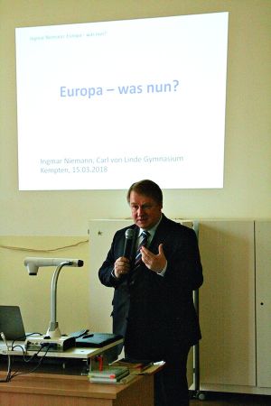 Erhard Tröster, Forenleiter der Friedrich-Naumann-Stiftung für die Freiheit/ Thomas Dehler Stiftung begrüßte die Schüler- und Lehrerschaft der 10. Klasse und der Oberstufe im Musiksaal des Carl-von-Linde-Gymnasiums. Die Stiftungen übernahmen die Finanzierung des Vortrags von Dipl.SC.Pol.Univ.M.A., Ingmar Niemann, Politikberater und Hochschuldozent u.a. an der FH in Kempten, der der Einladung von Angelika Brunner, Lehrkraft für Wirtschaft und Recht, gerne gefolgt war. Das Thema: „EU- was nun? /Macrons Europa- Perspektiven für die Zukunft “ war vor allem für die Leitfächer Sozialkunde, Wirtschaft/ Recht und Französisch von großem Interesse.