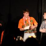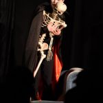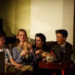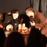 Das eigentliche Stück, der „Untergang des Grafen Dracu“ von Andreas Kroll, war eingebettet in diverse selbstgeschriebene Szenen, die eine Familie bei ihrem Fernsehabend zeigte. Dabei wurde schnell klar, dass Geschmack und Ansichten der vier Familienmitglieder nicht immer übereinstimmten. Emotionale Ausbrüche Daniels (Max Schindele) zum vermeintlichen oder tatsächlichen Tod verschiedener Figuren wurden gekontert vom Gepoltere des nüchternen und stets pragmatisch denkenden Großvaters (Marc Wingenfeld), da halfen auch die Vermittlungsbemühungen der Frau des Hauses (Anna-Sophie Menninger) über fundierte Informationen zu Eichendorff, dem Zustand der Welt oder anderen bedenkenswerten Inhalten nichts. Eine ökologische Komponente durch Hans-Peter (Moritz Kreße) durfte natürlich auch nicht fehlen, sei es nun in Form von verdauungsförderndem Tee oder einer automatischen Abschaltung des Stroms aus Sparsamkeitsgründen. Die Handlung um Graf Dracu (Felix Kordes) selbst nahm im Laufe der Szenen zunehmend an Fahrt auf: Die Anstrengungen des Grafen und seines einfach gestrickten, aber sehr charismatischen Dieners Igor (Timm Neumayer), seinen drohenden Bankrott durch eine Öffnung des Schlosses für Hochzeitsgesellschaften zu verhindern, führten zwar zu steigenden Einnahmen, aber zunehmend auch zu größeren oder kleineren Katastrophen, die nicht selten im Burggraben oder der Schubkarre endeten, sehr zum Ärger der geisterhaften Ur-Ahnin Elisabeth (Laura Müller). Das Stück endete schließlich gleich dreimal, der Graf musste zuerst schmelzen, weil Irene und Herbert, das heiratswillige Paar (Marie Wagner und Jonas Mayr), für strahlend helles Licht gesorgt hatte. Da das aber bei Daniel völlige Verzweiflung auslöste, wurde ein neuer Schluss gespielt, hier durfte der Graf Heilung und mit Herbert einen neuen Partner finden. Für den Großvater war das nun wieder viel zu kitschig, für ihn musste also noch ein realistischer Schluss her, in dem der Graf, eigentlich Patient in einer psychiatrischen Klinik, nach einem epileptischen Anfall liebevoll von seiner Ärztin (Anna Honold) und dem Pfleger Igor versorgt wurde. Untermalt wurde die gesamte Aufführung von Christian Röck am Klavier, für das richtige Licht sorgten Elia Albrecht, Lars Friedrich und Florian Renz.