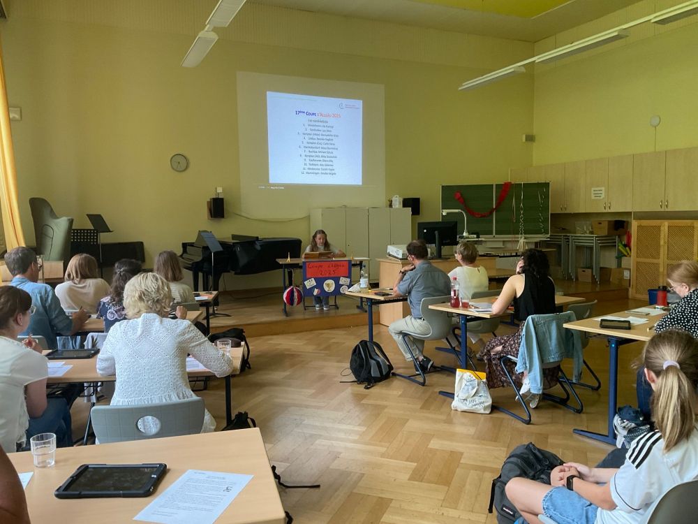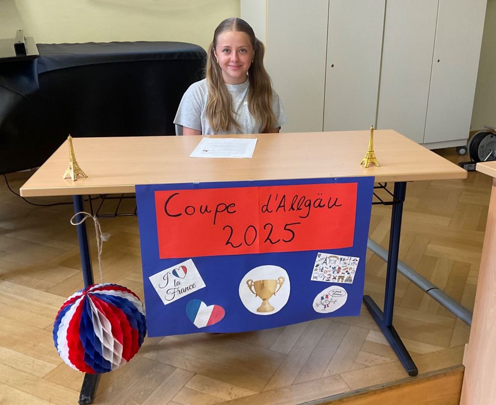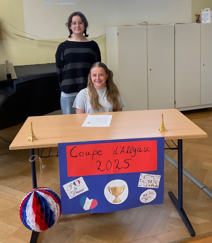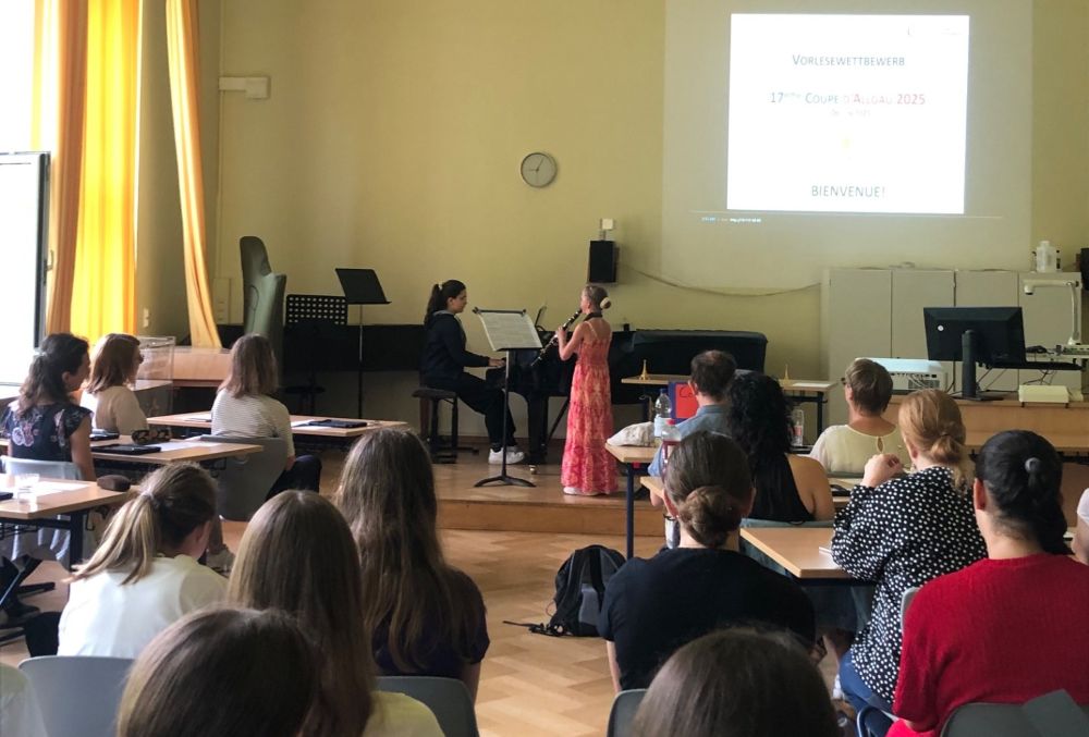 Am Donnerstag, den 26. Juni 2025, fand die 17. Ausgabe der „Coupe d’Allgäu“ am Carl-von-Linde-Gymnasium in Kempten statt. Bei diesem französischen Vorlesewettbewerb treffen sich jedes Jahr die besten Französisch-Schülerinnen und -Schüler der 7. Klassen aus dem ganzen Allgäu, um ihr Können unter Beweis zu stellen. Elf Gymnasien entsandten ihre Schulsieger, die sich in zwei spannenden Runden miteinander maßen: Zunächst mit einem selbstgewählten Text – meist aus dem aktuellen Lehrwerk – und anschließend mit einem unbekannten Auszug aus einem französischen Jugendroman. Eine echte Herausforderung für Lernende, die die Sprache erst seit knapp zwei Jahren lernen!