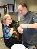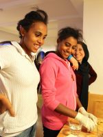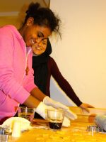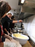 Ein bisschen nervös waren wir – 7 Schülerinnen der 8. und 10. Klasse sowie zwei Lehrerinnen – schon, als wir um kurz vor drei auf die Klingel der Einrichtung drückten. Ein Erzieher von „Kids 24“ öffnete uns und wir wurden in den Aufenthaltsraum neben der Küche geführt, wo bereits kiloweise Plätzchenteig und Backutensilien bereit lagen. Kurz darauf kamen auch schon die ersten Mädchen und begrüßten uns sehr herzlich. Etwas später trafen auch fünf Jungen aus dem „Gerhardinger Haus“ ein, was uns sehr freute – wir hätten nicht gedacht, dass sich so viele männliche Teenager aus Syrien und Eritrea fürs Plätzchenbacken interessieren würden. Zwei unserer Schülerinnen wurden gleich in die Küche beordert, wo sie zusammen mit zwei Flüchtlingsmädchen die Aufgabe hatten, für alle Waffeln zu backen. Die anderen verteilten sich an die Tische und nahmen sich mit großem Engagement dem Plätzchenteig an. Die Jungs aus dem „Gerhardinger Haus“ ließen sich dabei bereitwillig in die Kunst des Plätzchenbackens einführen, am anderen Tisch wurde viel gelacht, da der Teig für das Spritzgebäck etwas zu fest geraten war und dadurch eine Spritztüte nach der anderen platzte. Immer wieder kamen neue Mädchen, einfach nur um zu schauen, was im Aufenthaltsraum los war, oder um mitzumachen. Es herrschte eine sehr entspannte, lebhafte und fröhliche Atmosphäre und wir fühlten uns sehr wohl. Besonderen Spaß hatten sowohl wir als auch die Flüchtlinge beim Verzieren der Ausstecherle. Das Team von „Kids 24“ hatte dafür Zuckerguss in allen möglichen Farben und ein ganzes Sortiment an bunten Perlen und Streuseln bereitgestellt, und so hatten wir am Ende nicht nur sehr viele, sondern vor allem auch extrem bunte und reichdekorierte Plätzchen. Nach getaner Arbeit gab es noch eine Überraschung: Auf einem Servierwagen wurden, begleitet von bengalischen Feuern, die Waffeln in den Aufenthaltsraum gefahren, und es gab noch eine kleine Waffel-Party mit viel Sahne und Apfelmus.