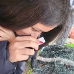 Die erste führte den Kurs auf den evangelischen Friedhof unterhalb der Burghalde, denn hier lassen sich Magmatite, Migmatite, Metamorphite und Sedimentite nicht nur in kleinen Handstücken vergleichen, nein, ein Grabstein ist meist doch recht groß und damit natürlich auch eindrucksvoller. Man kann die einzelnen Minerale in voller Größe betrachten, mit der Lupe im Detail untersuchen und außerdem mit den Mineralen den nebenstehenden Grabsteins direkt vergleichen. So bekamen die Gesteine trotz des Dauerregens ein Gesicht!