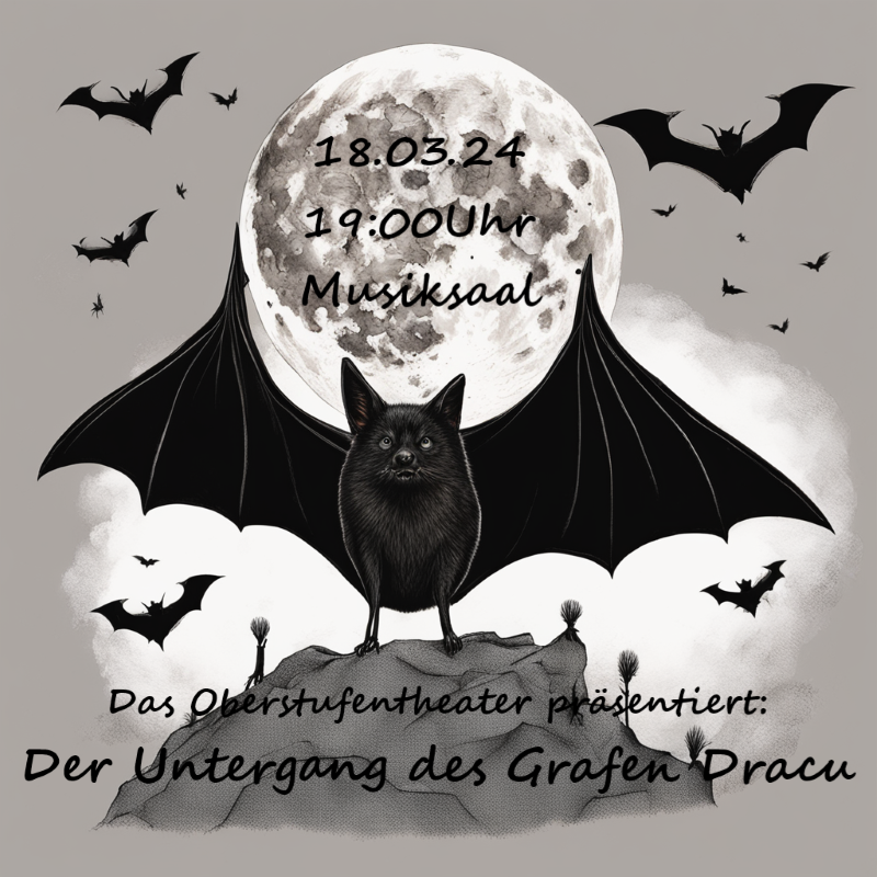 Die Theatergruppe der Oberstufe lädt ganz herzlich ein zur Aufführung der Komödie "Der Untergang des Grafen Dracu" von Andreas Kroll, eingebettet in eine gemeinschaftliche verfasste Familienszenerie.