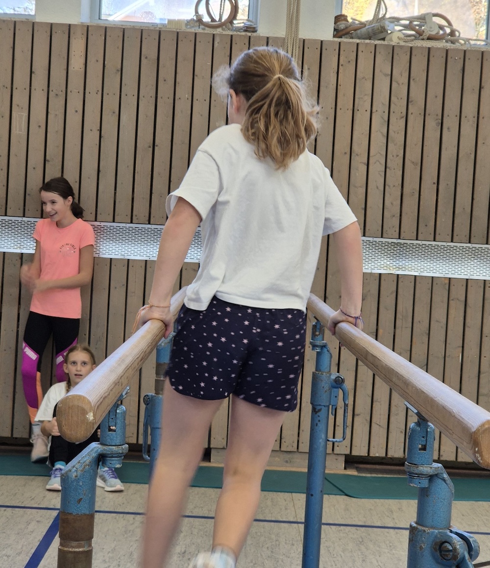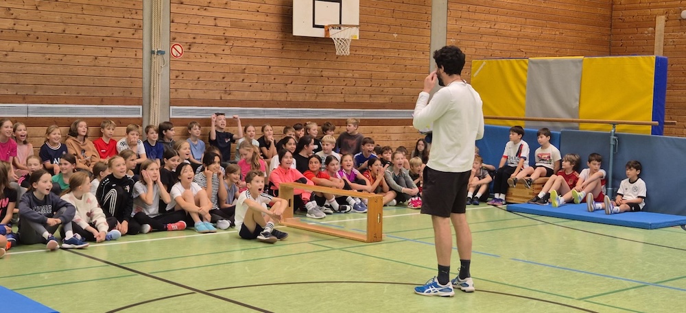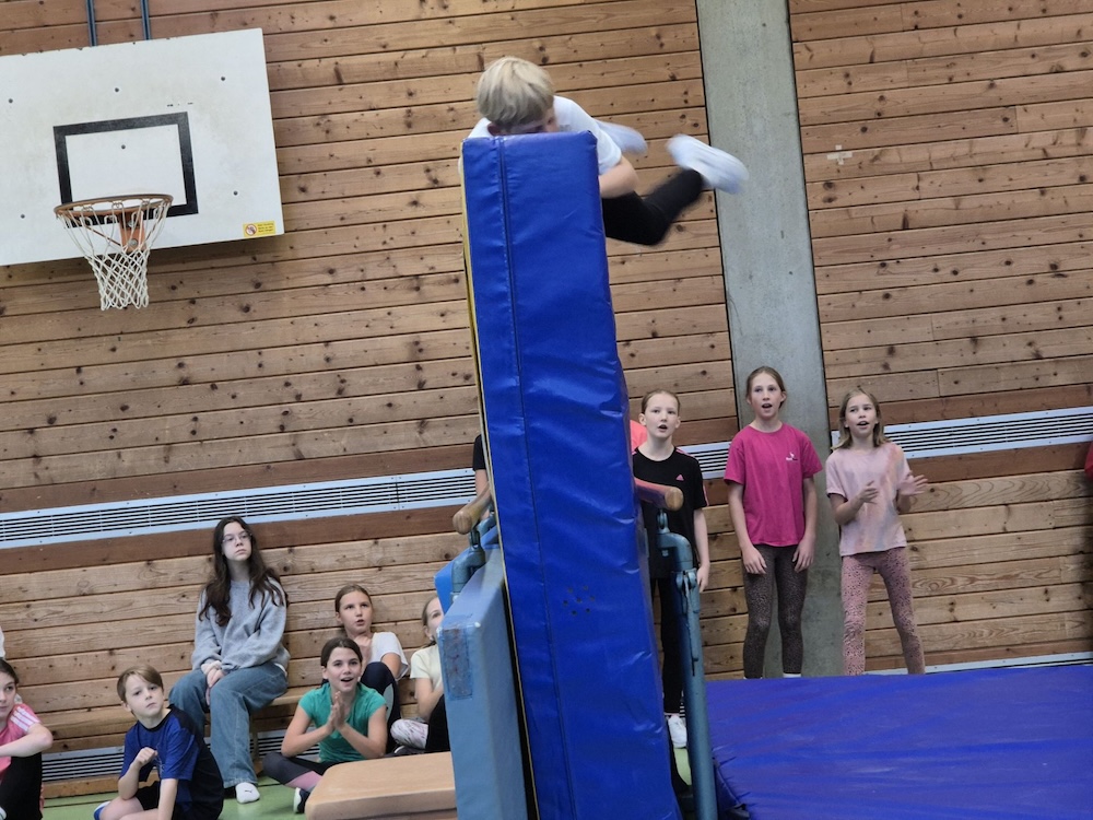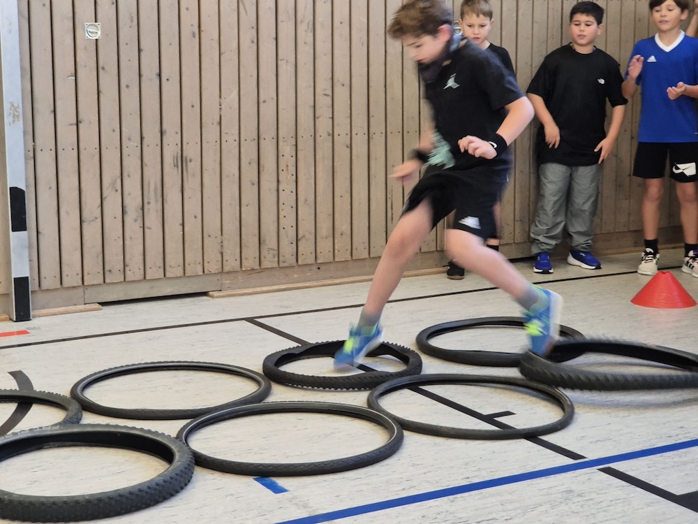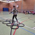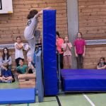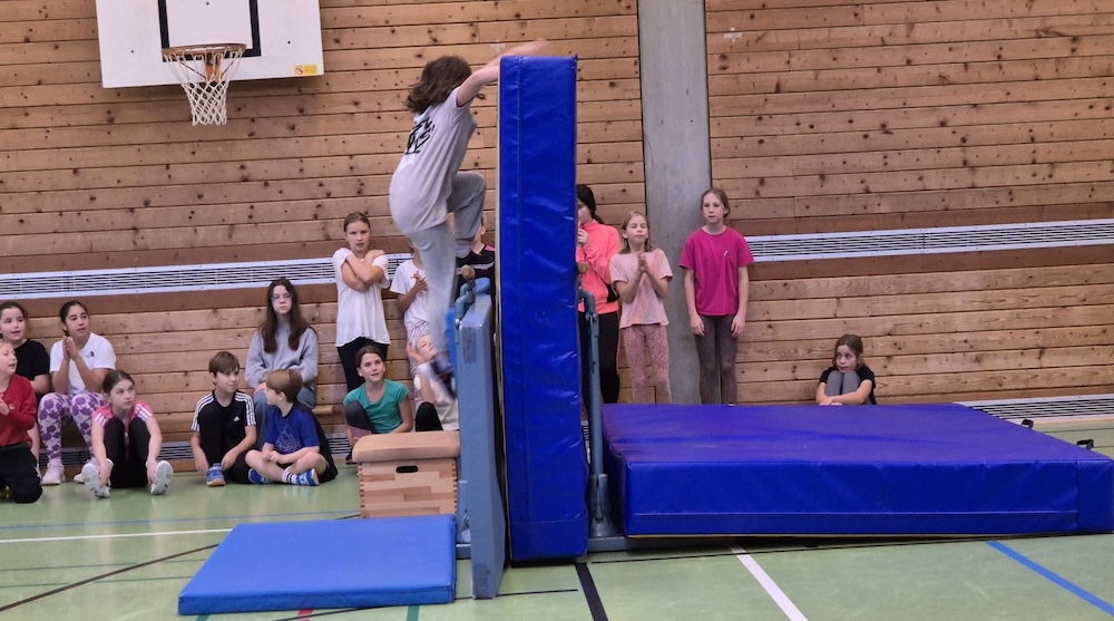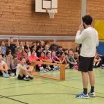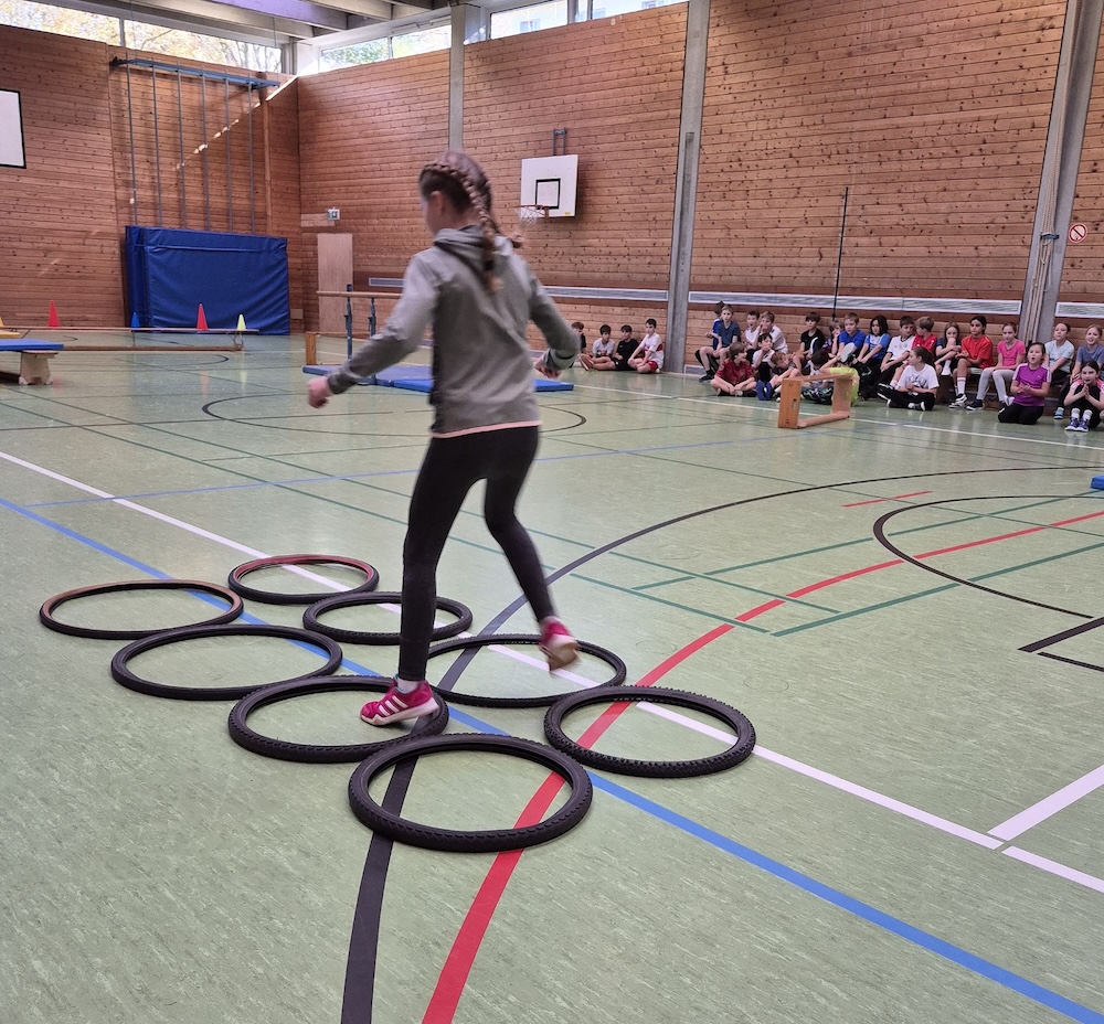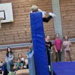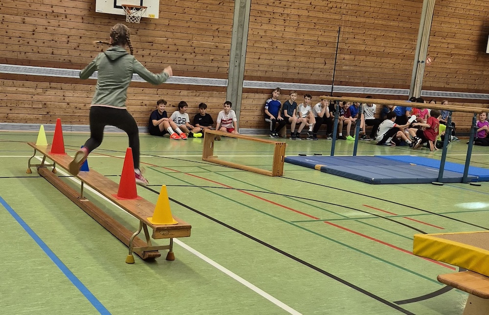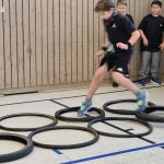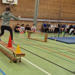 In diesem Schuljahr fand erstmalig am Freitag vor den Herbstferien für alle Schülerinnen und Schüler der 5. Klassen ein Ninja-Warrior-Wettbewerb statt. In Anlehnung an die Trendsportart „Parkour“ wurde in beiden Turnhallen ein baugleicher Hindernisparkour aufgebaut. Die Besonderheit an Parkour ist, dass wichtige gesundheitsförderliche Ressourcen von Schülerinnen und Schülern, wie z. B. die Ausprägung von konditionellen und koordinativen Fähigkeiten, die Entwicklung einer individuellen Risikokompetenz sowie die gegenseitige Unterstützung und Kooperation bei notwendigen Hilfe- und Sicherheitsstellungen an Gerätearrangements, gefördert werden. Unter den Anfeuerrungsrufen der Mitschüler durchliefen alle die Runde und ihre Zeit wurde gestoppt. So konnten sowohl die schnellsten Einzelläufer als auch die schnellste Klasse ermittelt werden.