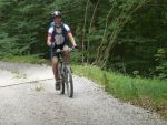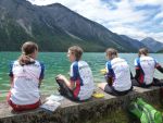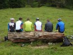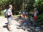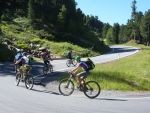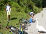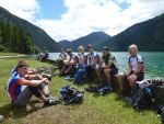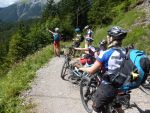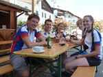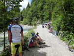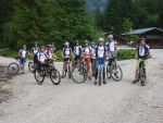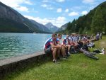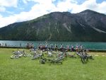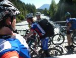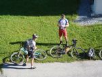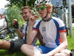 Sonntag morgen ging es dann endlich los. Der lang ersehnte Start befand sich im 'Köings'sträßchen bei Füssen, das über Umwege, welche z.T. die ersten km auf dem Rad für manche Schüler waren, gefunden wurde. Unter Anfeuerungsrufen der mitgereisten Eltern startete unsere Truppe um 8:30 vom Parkplatz und musste unmittelbar einen starken Anstieg zum Schloss Neuschwanstein in Angriff nehmen - problemlos. Ein weiterer Anstieg von etwa einer Stunde folgte und endete schließlich in der wohlverdienten ersten Pause. Jetzt folgte das technisch anspruchsvollste Stück der ersten Tage - ein Trail über Stock und Stein bei dem Knochen und Bein von Schülern und Lehrern z.T. in Mitleidenschaft gezogen wurden. Nach Akkordarbeit des erste Hilfe - Teams, Plünderung von Kili's Globoli Vorrat und verarzten aller Wehwechen gab es eine erneute Stärkung am Plansee. Weitere Kilometer wurden souverän auf einem Schotterweg hinter sich gebracht. Der letzte Höhepunkt der ersten Etappe war der Fernpass. Dieser wurde mit viel Fleiß und Schweiß überwunden. Anschließend erholten wir uns am eiskalten Bernsteinsee. Ein Schwan sorgte während dieser Pause immer wieder für Schrecken und verscheuchte den ein oder anderen Schüler von seinem entspannten Sonnenplatz.