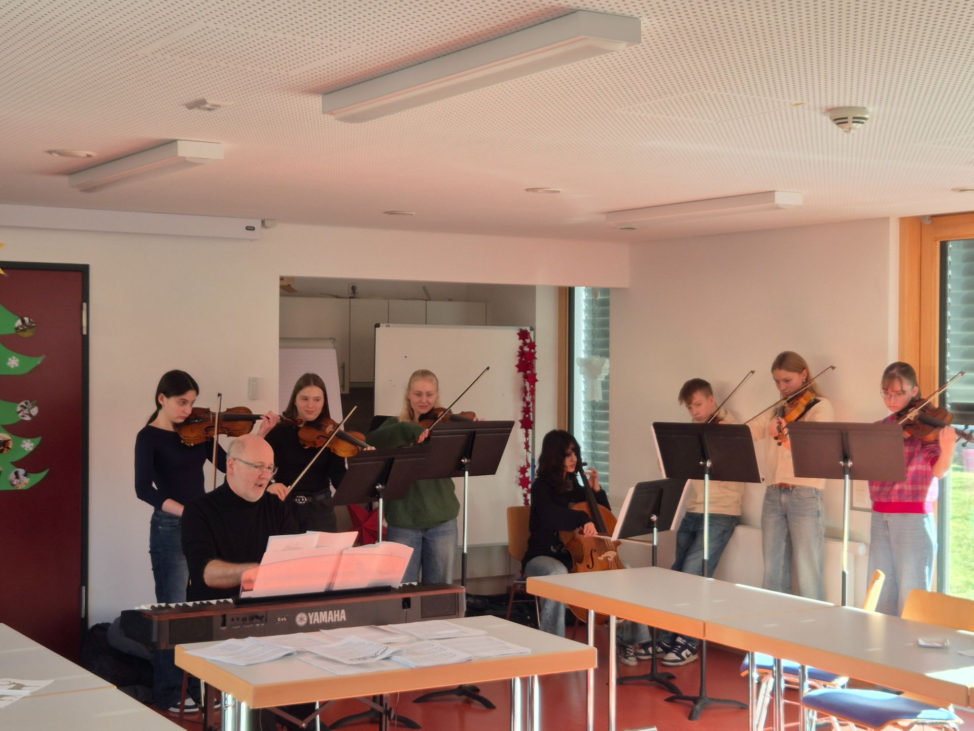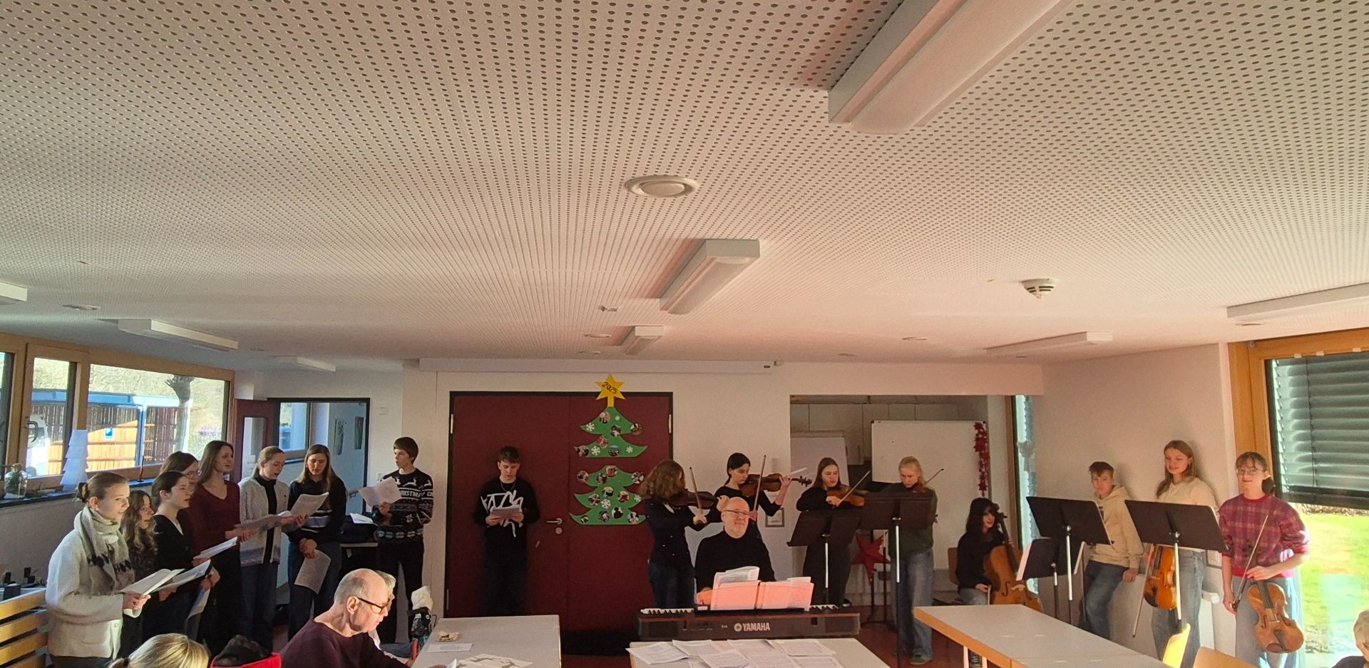 Schülerinnen und Schüler der Klasse 9c besuchten am vorletzten Schultag vor den Weihnachtsferien die Tagesstätte der Lebenshilfe Kempten und sangen und musizierten eine Stunde lang mit den versammelten Bewohnerinnen und Bewohnern Weihnachtslieder.