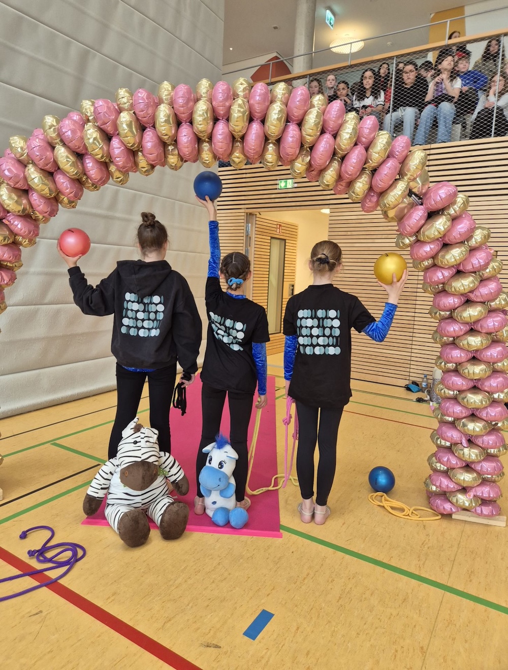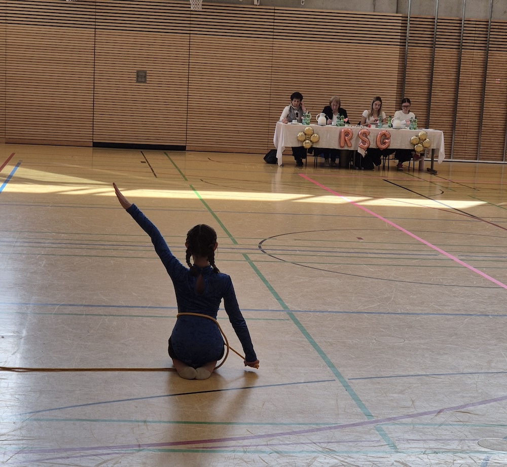 Um 10.00 Uhr versammelten sich alle Mannschaften zum offiziellen Beginn des RSG-Wettkampfes. Nun galt es mit verschiedenen Handgeräten der Rhythmischen Sportgymnastik die vorgeschriebenen, anspruchsvollen Übungen zur Musik Kampfrichtern und Publikum bestmöglich zu präsentieren. Nicht alles gelang. Die Aufregung, auf einer 12x12 großen Fläche ganz allein Seil und Ball unter Kontrolle zu halten – und das unter den gestrengen Augen der Jury –, war unter den Gymnastinnen groß. Dennoch halfen der große Teamgeist und die Maskottchen dabei, die Fehler ganz schnell zu vergessen und sich gemeinsam über die gelungenen akrobatischen Teile zu freuen.