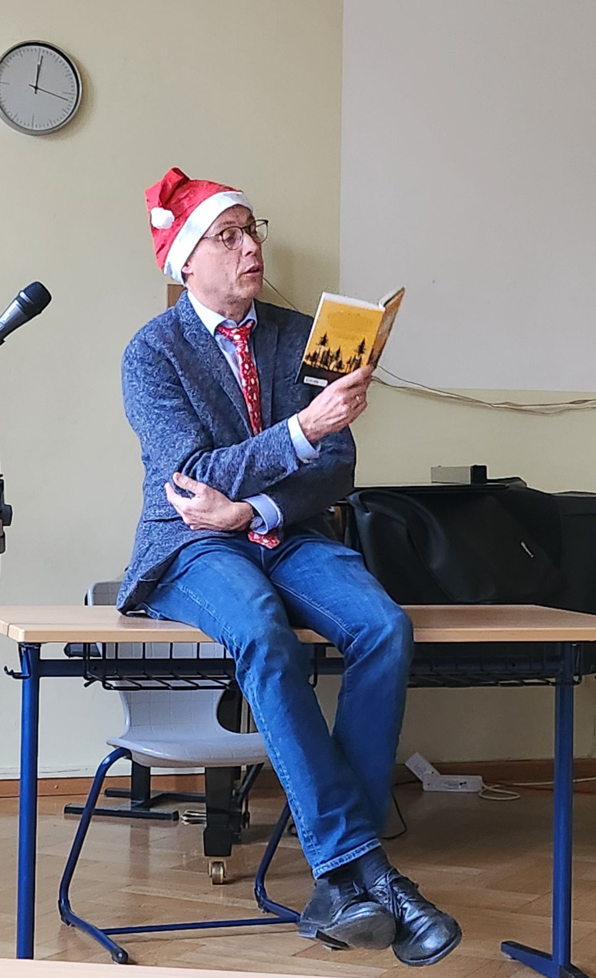 Während die Jury, bestehend aus den drei Deutschlehrkräften und der Schulsiegerin des Vorjahres, über die Entscheidung beriet, blieb es literarisch: Der Schulleiter las zur Überbrückung weiter aus „Wolf“ vor und sorgte so für eine entspannte, neugierige Stimmung im Saal.