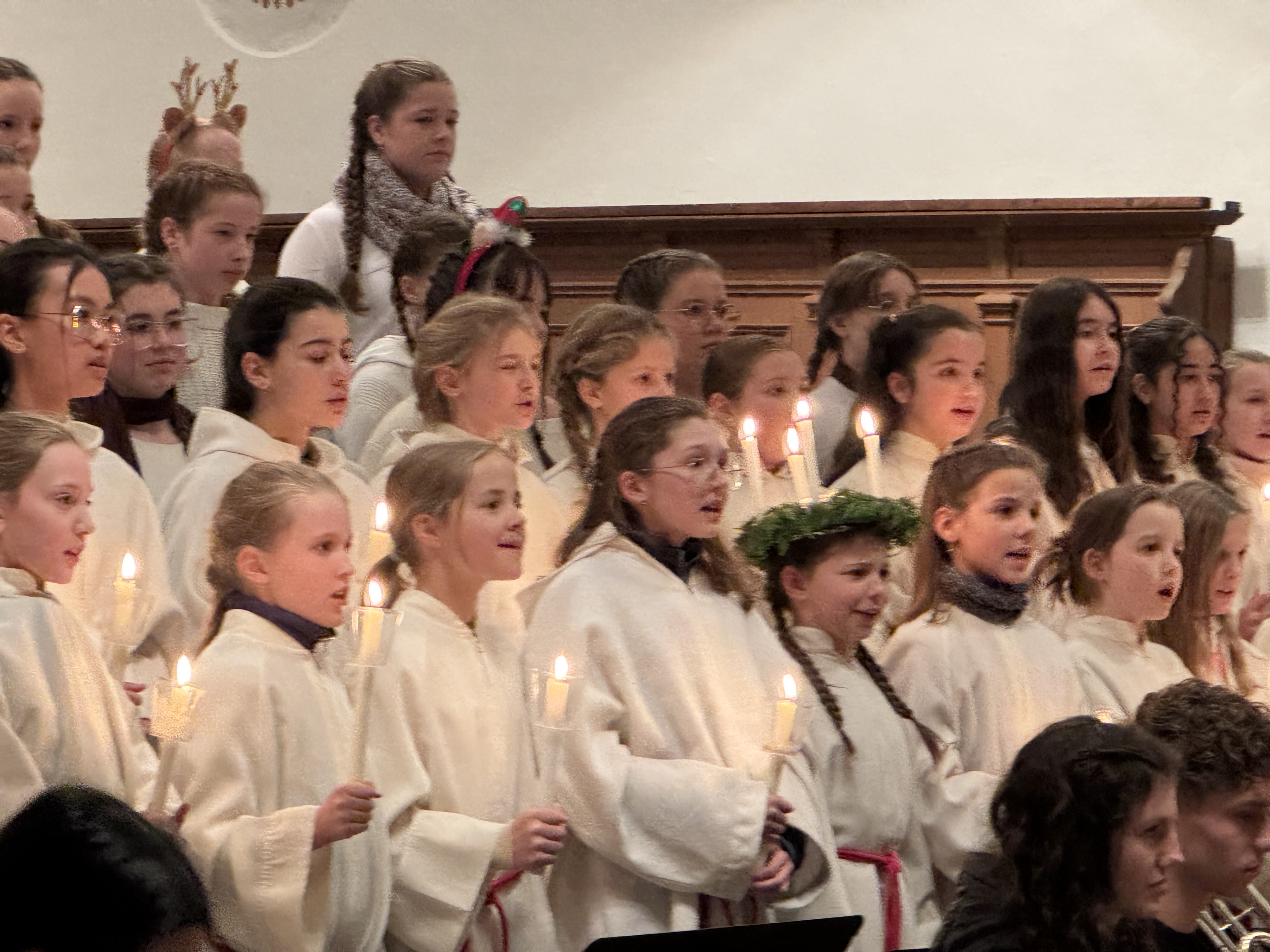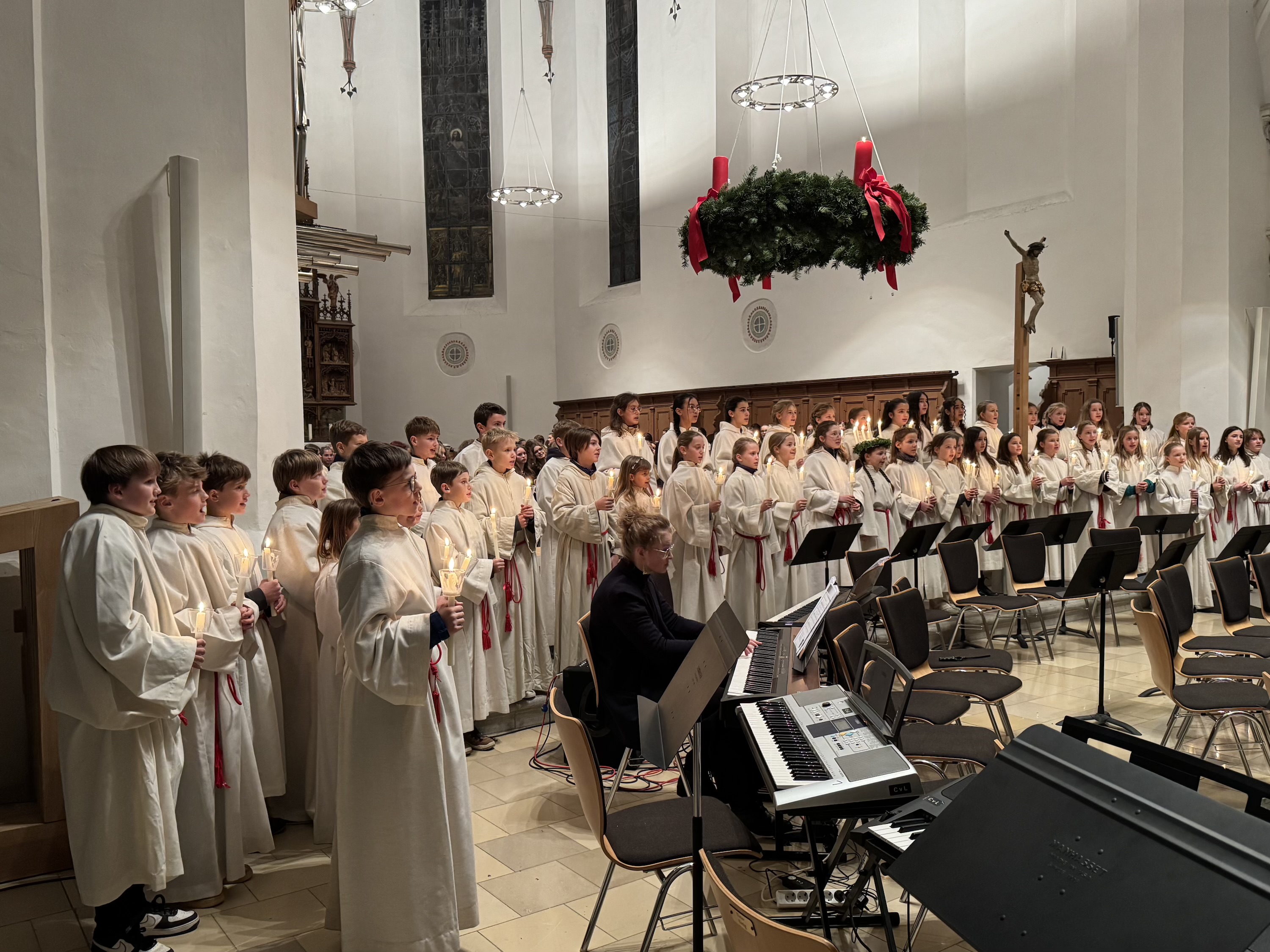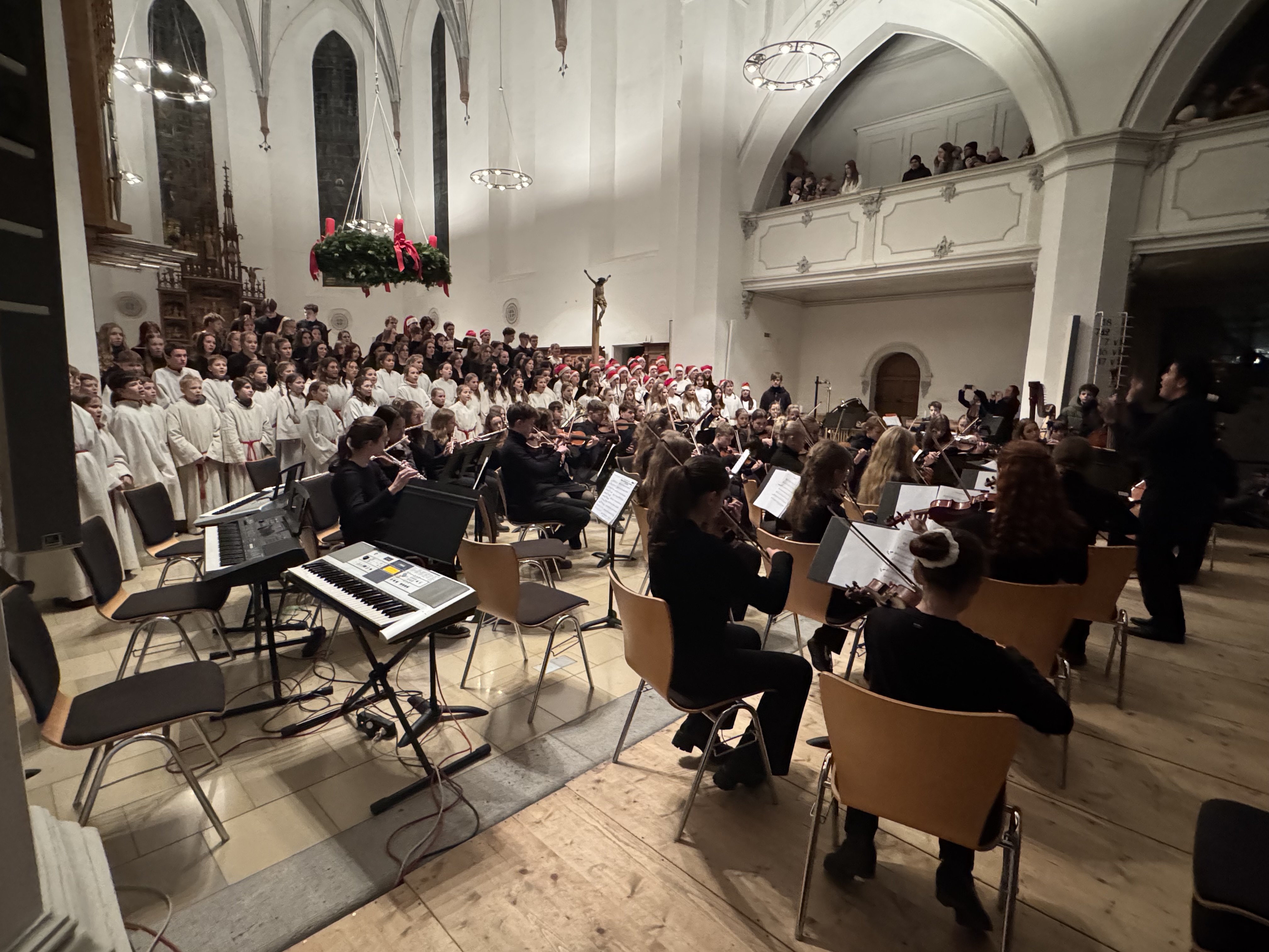 Mit einem beeindruckenden Weihnachtskonzert versetzte das Carl-von-Linde-Gymnasium Kempten die vollbesetzte St.-Mang-Kirche in festliche Stimmung. Über 200 musizierende Schülerinnen und Schüler zeigten in den beiden Orchestern, in den drei Chören und in der Bigband außergewöhnliche musikalische Leistungen. Besonders hervorzuheben ist die herausragende Leistung von Viktoria Lukschandel (8c), welche mit Buxtehudes Präludium und Fuge in C - Dur an der Orgel brillierte.