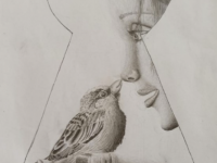 Ein junges Mädchen (Lesbia) schaut verliebt einen Vogel an – oder er sie? Dieses Bild von Felix Cordes (10b) hat den Weg in das Buch "Catull in Bild und Ton" gefunden - eine große Anerkennung für den jungen Künstler!...