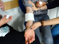 Am Tag der Schulolympiade fand für die 9. und 10. Klassen ein Tag der Ersten Hilfe statt. Pünktlich begannen Schulungen in zentralen Bereichen wie Verband, Verhalten bei Unfällen, Stabile Seitenlage und Maßnahmen zur Wiederbelebung, Handhabung des Defibrillators...